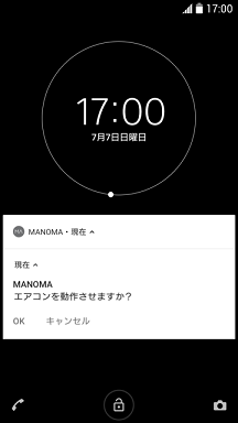 外出先からでも戸締りを確認でき、開いていたら遠隔で施錠操作が可能です。また、アプリが自宅に近付いたことを検知すると、プッシュ通知でエアコンをつけるかどうか提案し、通知画面からアプリを開くことなくエアコンの操作をすることができます。