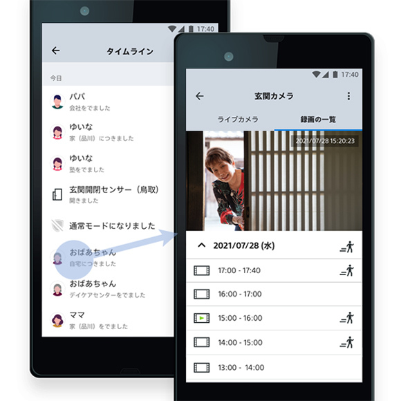 アプリのタイムラインには、センサーを通じて家族の帰宅・外出・扉の開閉などのイベントが記録されるため、隙間時間などに、遠隔地に住む家族の生活を把握することが可能です。イベントからカメラで撮影された録画動画にアクセスでき、家族の様子をアプリから見返すこともできます。また、家族の帰宅に合わせて「おかえり」といった声がけをアプリから室内コミュニケーションカメラを通して行うこともでき、心地よい距離感で家族を見守ることができます。