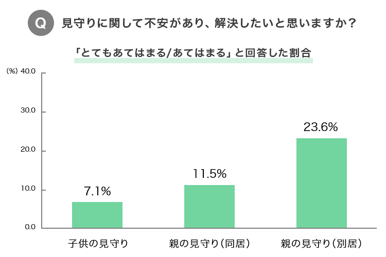 当社は、見守りやセキュリティサービスに対するニーズ調査を実施し、『見守りに関して不安があり、解決したいと思うか?』などを問うアンケートを行いました。結果、別居している親の見守りに不安を感じ、解決したいと考える人が23.6%にのぼることが判明しました。